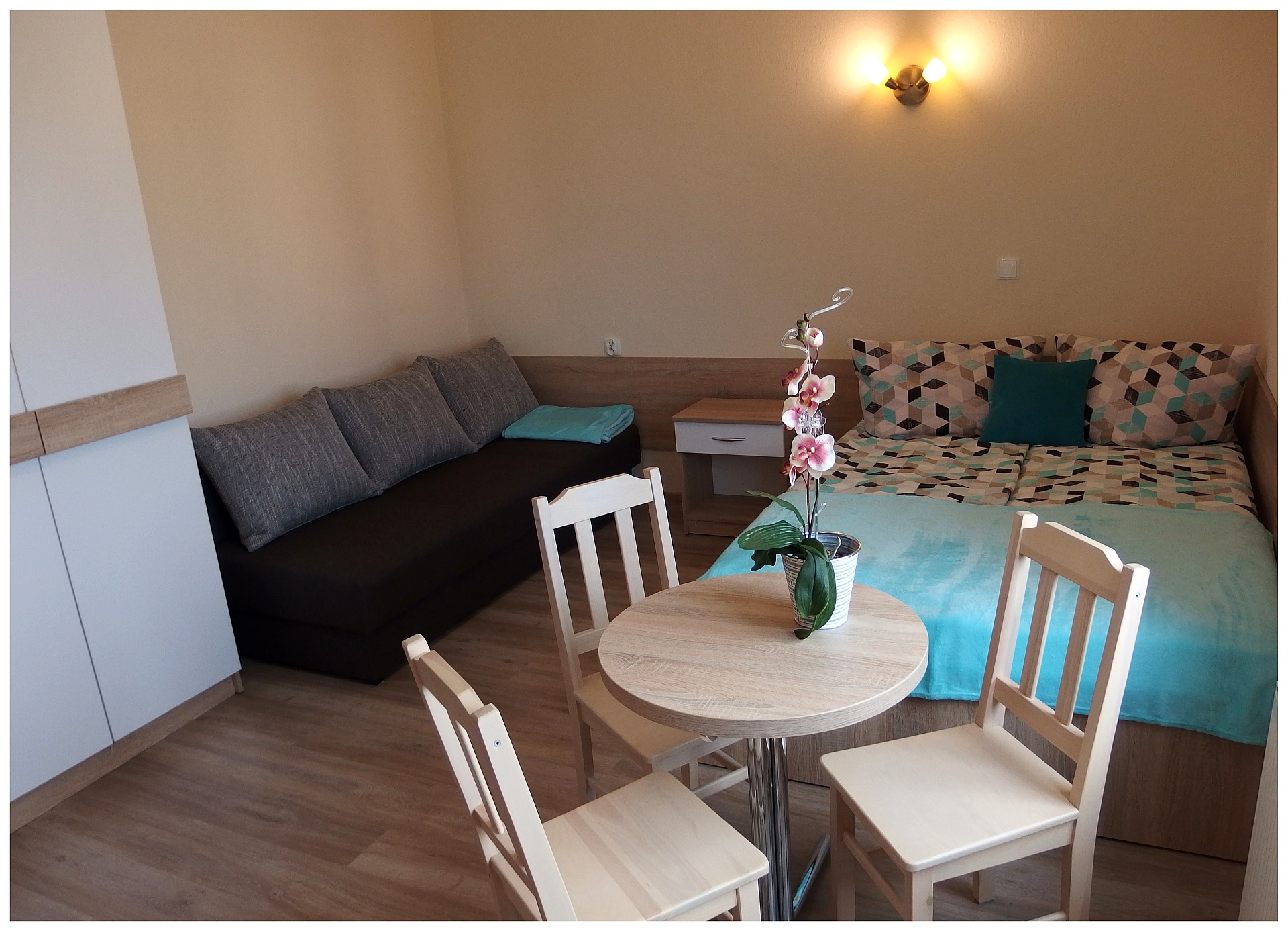 Pokój Lazurowy z łóżkiem małżeńskim oraz sofą wypoczynkową z funkcją spania. Idealne rozwiązanie zarówno dla dwojga, jak i rodziny z dwójką dzieci.